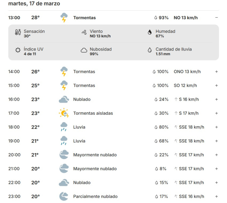 El pronóstico coincide con los datos de The Weather Channel, que prevé tormentas durante las 13hs, con alta probabilidad de precipitaciones -que en algunos tramos alcanza el 100%- y temperaturas que oscilarán entre los 28°C y los 23°C. Hacia la noche, en tanto, el tiempo irá mejorando con cielo mayormente nublado.