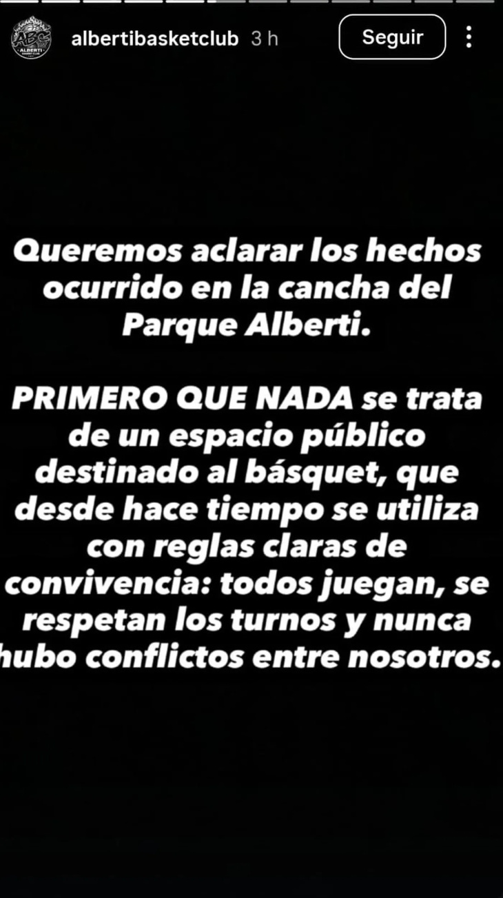 El violento episodio ocurrido en la cancha de básquet del Parque Alberti sumó un nuevo capítulo en las últimas horas, luego de que los jóvenes que utilizan habitualmente el espacio difundieran un descargo para aclarar lo sucedido.