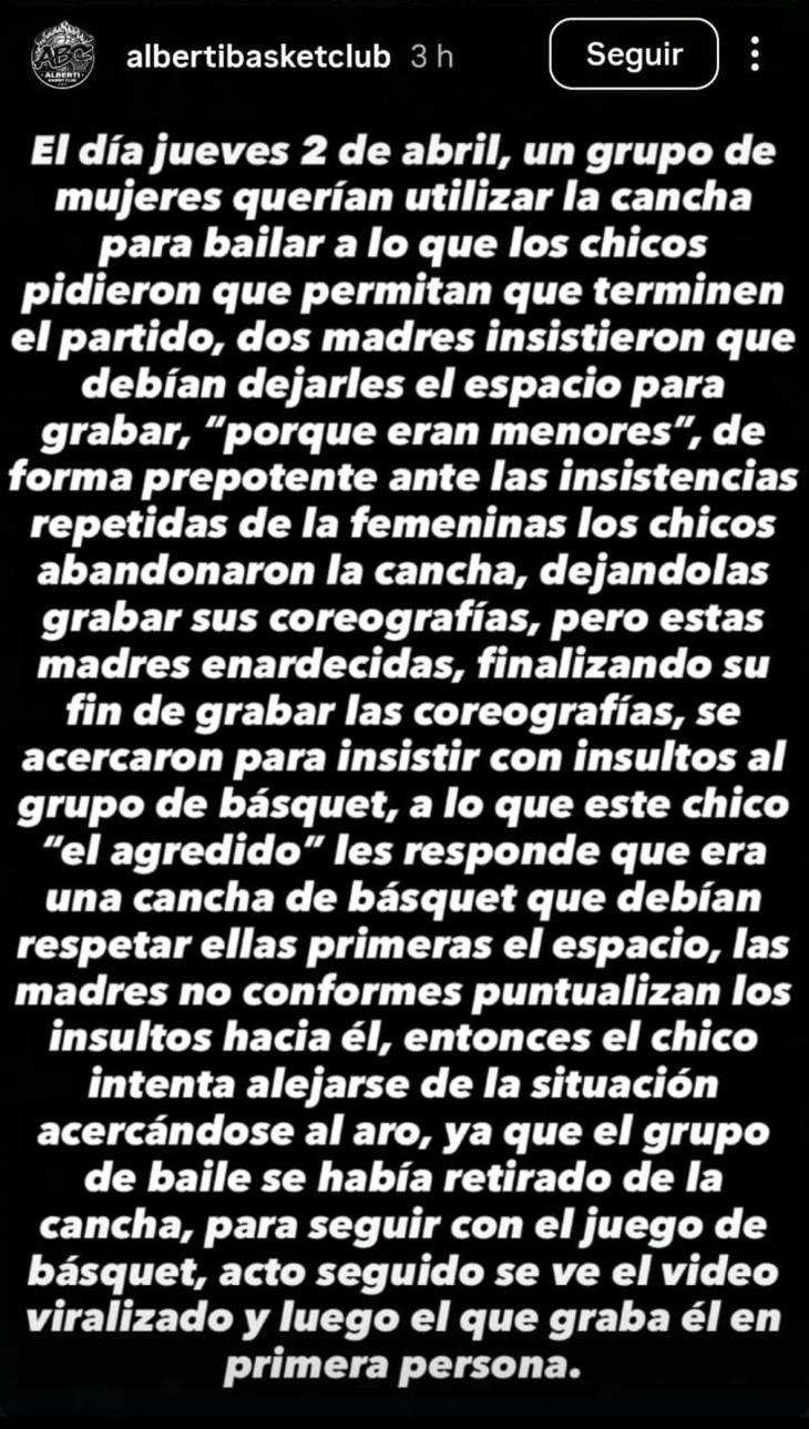Según explicaron desde la comunidad Alberti Basket Club (ABC), el conflicto se originó cuando un grupo de mujeres y chicos ingresó a la cancha con la intención de utilizarla para bailar, mientras se disputaba un partido.
