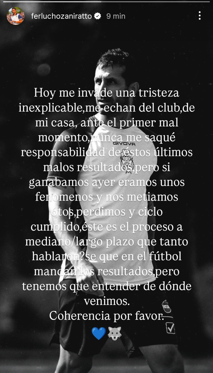 El ahora ex entrenador del Lobo, no quedó conforme con la decisión tomada por la CD y lo hizo saber en sus redes sociales. El DT publicó un extenso texto en una serie de historias de Instagram comentando su salida desde su perspectiva.