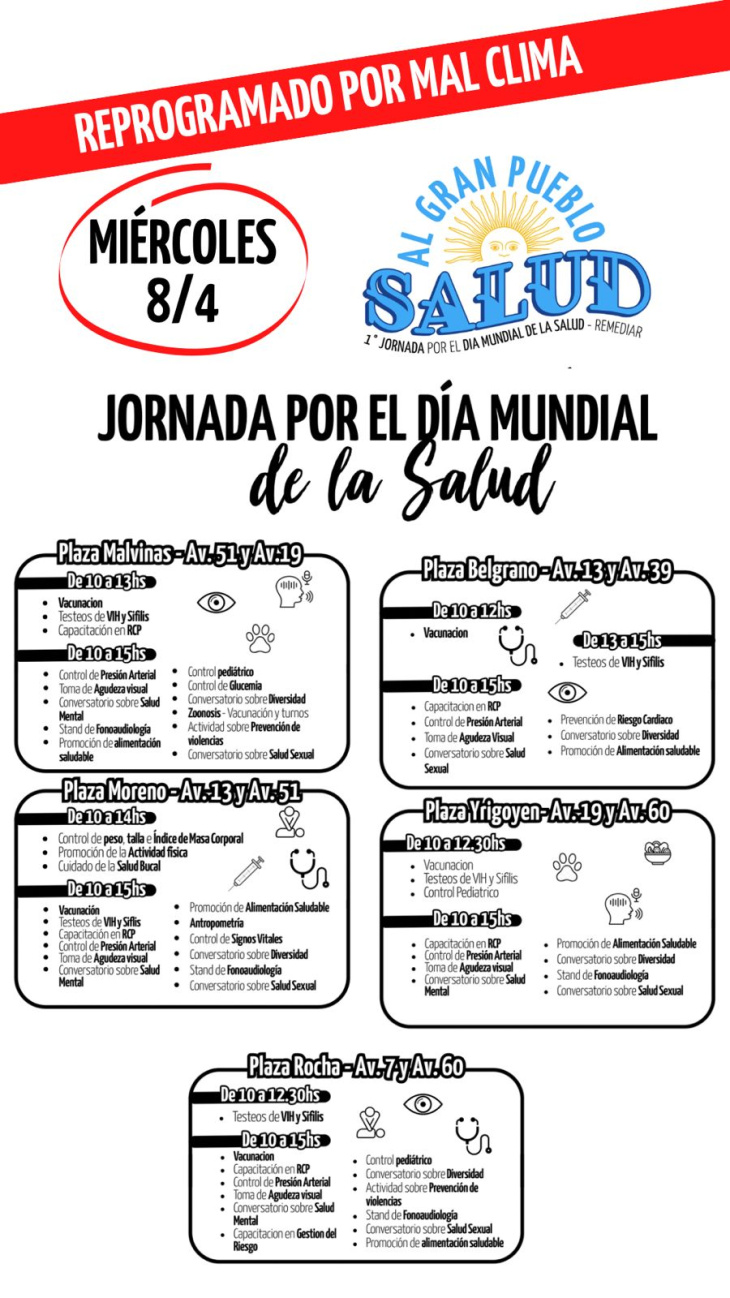 Las actividades se realizarán en Plaza Moreno, Plaza Malvinas, Plaza Rocha, Plaza Belgrano y Plaza Yrigoyen, donde se ofrecerán servicios gratuitos como vacunación de calendario, testeos rápidos de VIH y sífilis, controles de presión arterial, peso y talla, además de capacitaciones en RCP y espacios de salud mental.