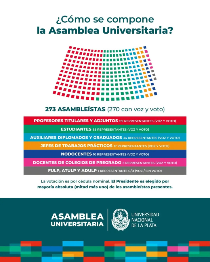 La Universidad Nacional de La Plata cuenta con 273 asambleístas (de los cuales 270 tienen voz y voto). En esta ocasión, el único candidato es el Dr. Arq. Fernando Tauber, quien irá por su tercer periodo al frente de la UNLP y reemplazará a Martín López Armengol, quien fue elegido como decano de la Facultad de Ciencias Económicas.