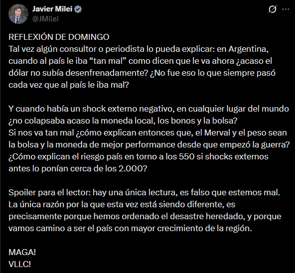 En su mensaje, el mandatario cuestionó las interpretaciones negativas sobre la economía y planteó una serie de interrogantes dirigidos a analistas y periodistas. “Cuando al país le iba ‘tan mal’ como dicen que le va ahora, ¿acaso el dólar no subía desenfrenadamente?”, escribió, en referencia a la estabilidad cambiaria como uno de los principales argumentos del oficialismo.