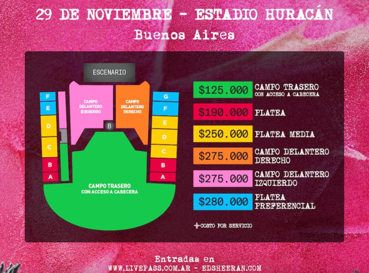 Las entradas ya tienen precios definidos: el Campo Trasero costará $125.000, mientras que las plateas irán desde $190.000 hasta $280.000. El Campo Delantero, por su parte, se ubicará en $275.000. A estos valores se les deberá sumar el cargo por servicio de la ticketera.