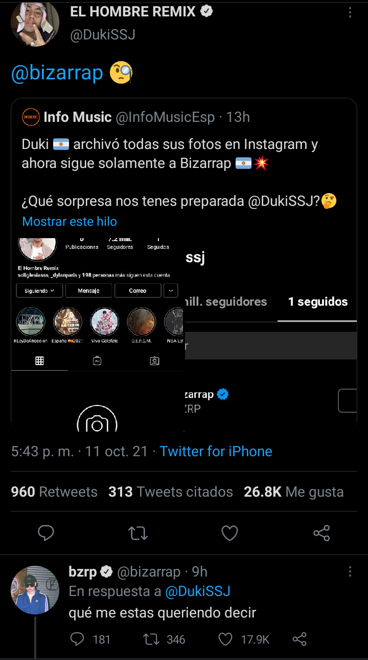 Duki por su parte, retuiteó la información etiquetando al “Biza” que le respondió: “que me estás queriendo decir” para generar más sorpresa aún en los fans de ambos artistas argentinos.